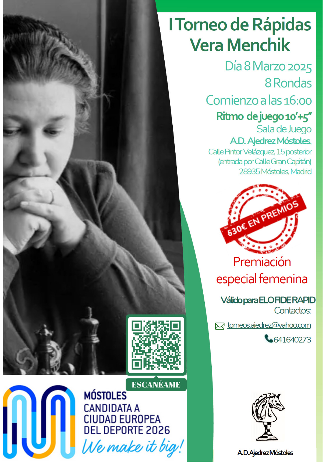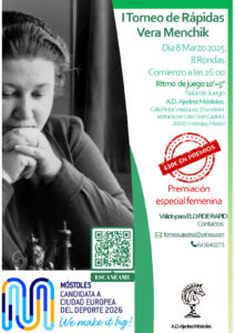 Desde la Agrupación Deportiva Ajedrez Móstoles, tenemos el placer de anunciar la inauguración del I Torneo Rápidas Vera Menchik, en honor a la primera campeona del mundo femenina de ajedrez, que se disputará el 8 de marzo, haciendo énfasis en la premiación femenina, igual a la absoluta. A continuación, podreis ver las bases del torneo : Bases I Torneo Rapidas Vera Menchik